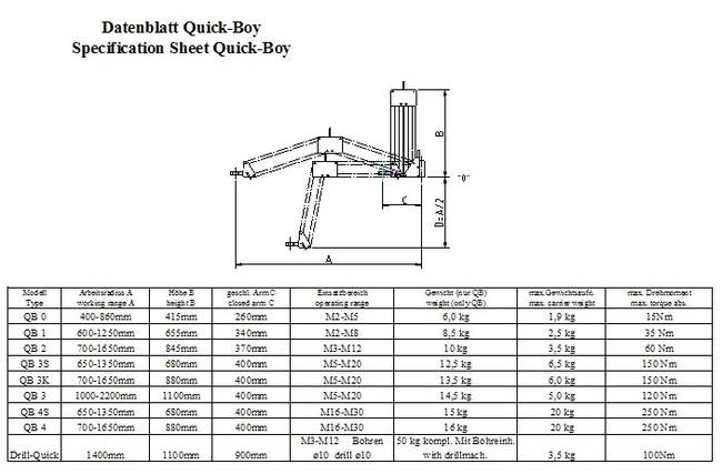 Articulated arm tapping machine Fabr WIEDMANN Type Quick Boy Gr. 1 Year 1994 Technical data: Tapping the M 2 – M 8 working radius of 600-1250 mm Machine Carrying capacity 2,5 kg Max. Torque 35 N / m Speed of Tapping Machine 665 rpm. used quick-change 5 M, in good condition – with